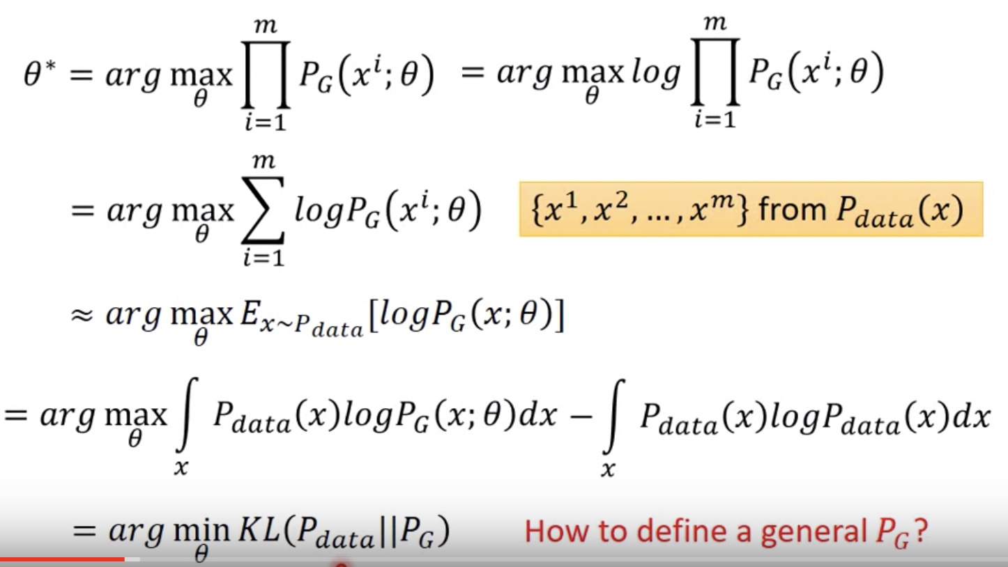 - GAN的终极目的,其实是用$P_G(x)$拟合真实的$P_{data}(x)$,最直接的想法是用MLE来做,MLE实际上和最小化KL距离是等同的,证明见下张图